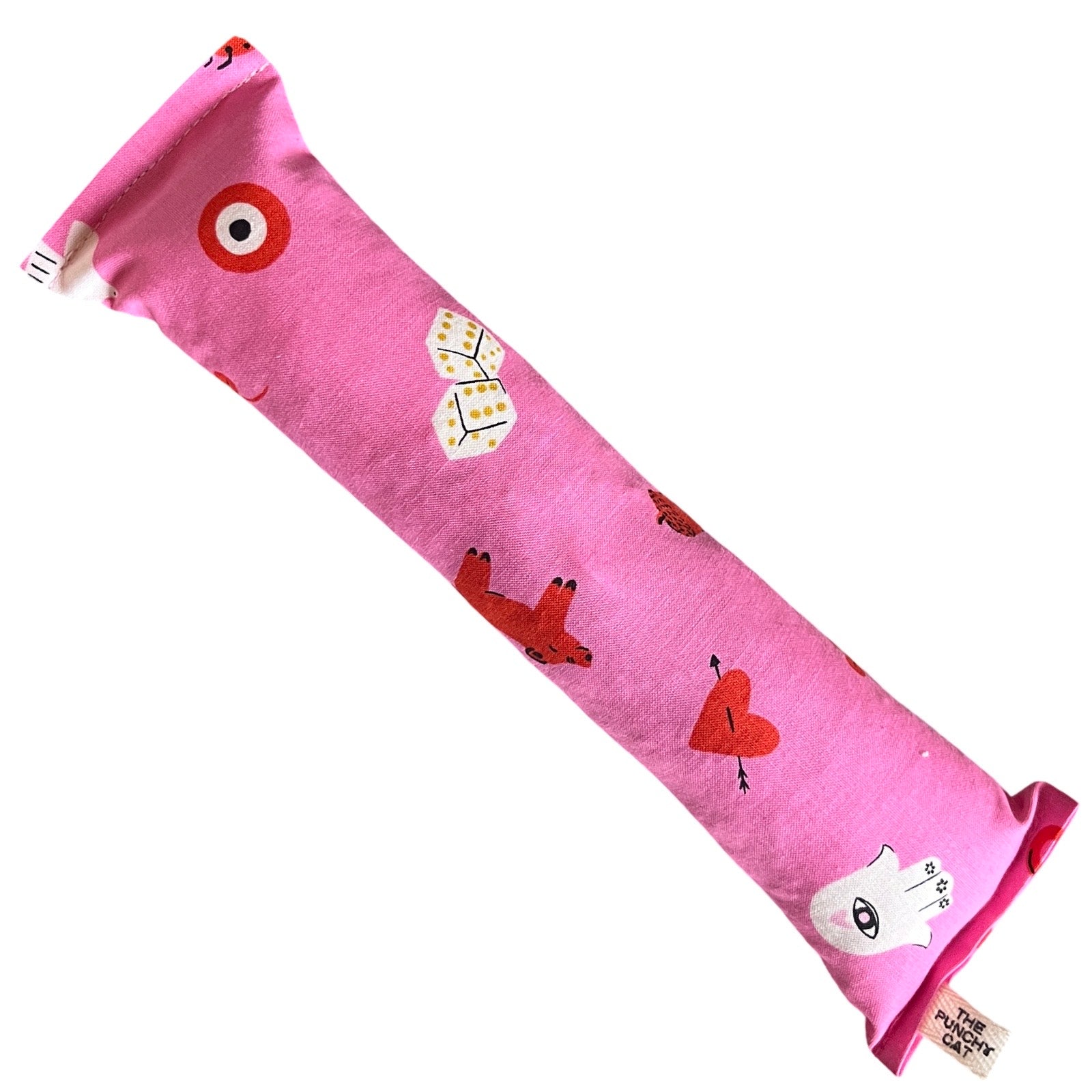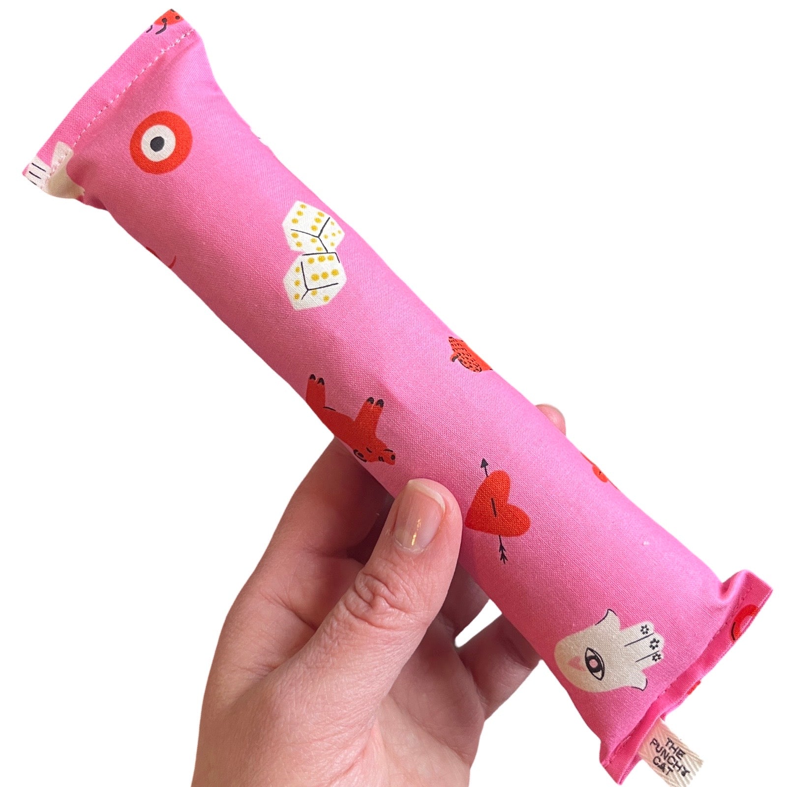 Print fabric kicker log filled with potent silvervine and catnip mix and polyfill stuffing as well as a rattle disk to entice your kitty's prey drive.