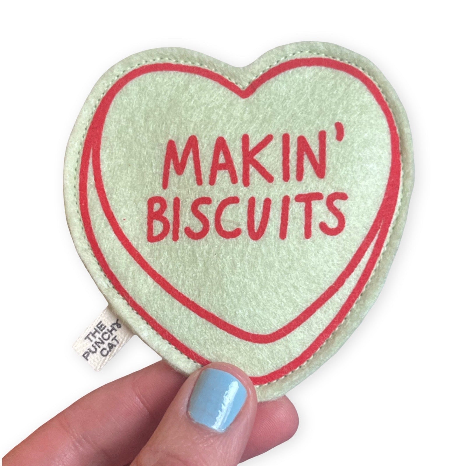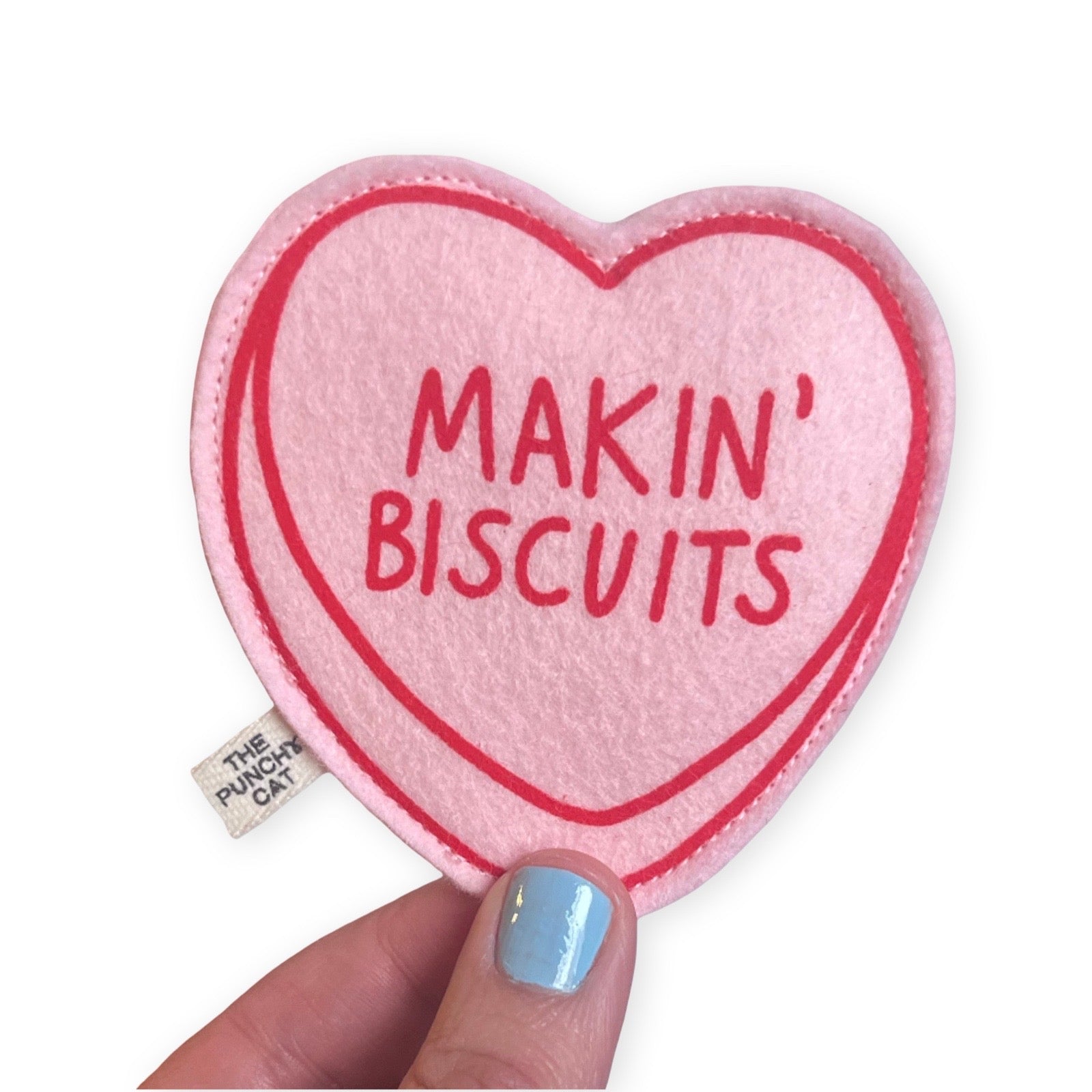 This super potent cat toy is made with 2 layers of wool felt and stuffed with organic catnip and silvervine mix. Screen printed with red "MAKIN' BISCUITS" candy heart design.