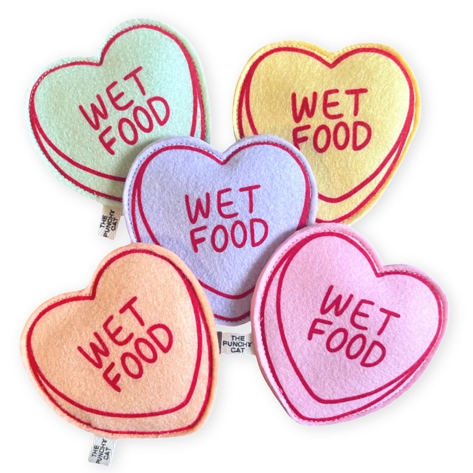 This super potent cat toy is made with 2 layers of wool felt and stuffed with organic catnip and silvervine mix. Screen printed with red "WET FOOD" candy heart design. Each catnip candy heart will look very much like the ones in the photos. Every toy is one-of-a-kind and variations are to be expected as is the charming nature of a handmade product.